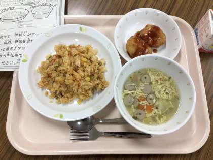 今日は、ツナピラフ、豆腐のナゲット、にんにく玉子スープ、牛乳です。