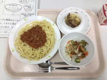 今日は、スパゲッティミートソース、ごぼうチップサラダ、マーブルマロンケーキ、牛乳です。