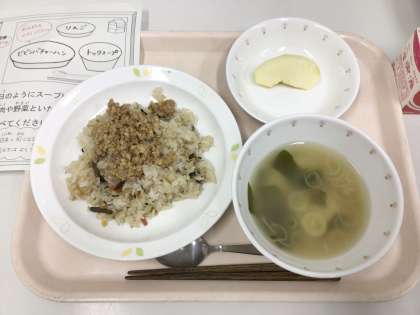 今日は、ビビンバチャーハン、トックスープ、りんご、牛乳です。