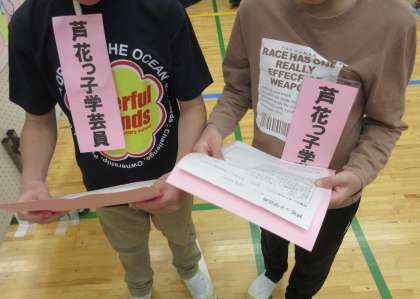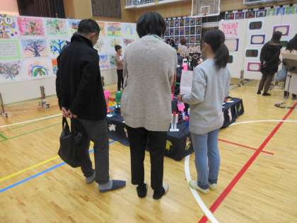 今日は午前中のみ、5・6年の子どもたちが「芦花っ子学芸員」として会場に立ち、作品紹介を保護者や地域の方々に行いました。
