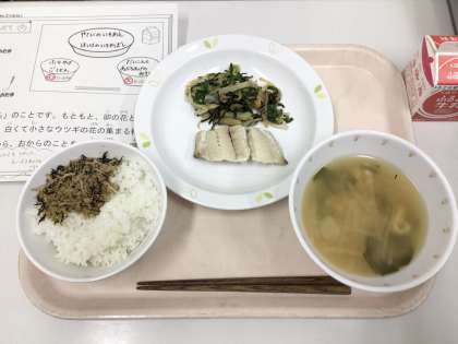 今日は、ごはん、卯の花ふりかけ、ほっけの一夜干し、野菜の磯あえ、大根と油揚げのみそ汁、牛乳です。