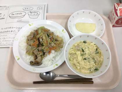 今日は、中華丼、中華風コーンスープ、りんご、牛乳です。