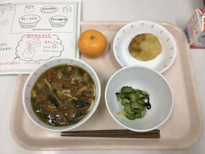 今日は、カレーうどん、野菜の浅漬け、もちもちポテト、みかん、牛乳です。