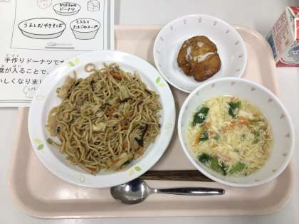 今日は、うま塩焼きそば、豆腐と玉子のスープ、かぼちゃのドーナツ、牛乳です。