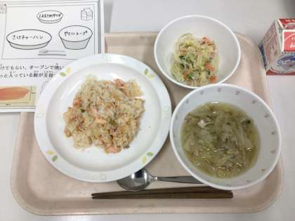 今日は、鮭チャーハン、春雨サラダ、野菜のスープ、牛乳です。
