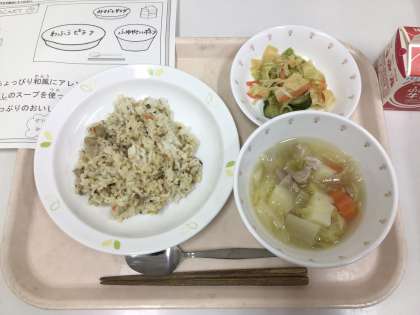今日は、和風ピラフ、冬ポトフ、みそドレサラダ、牛乳です。