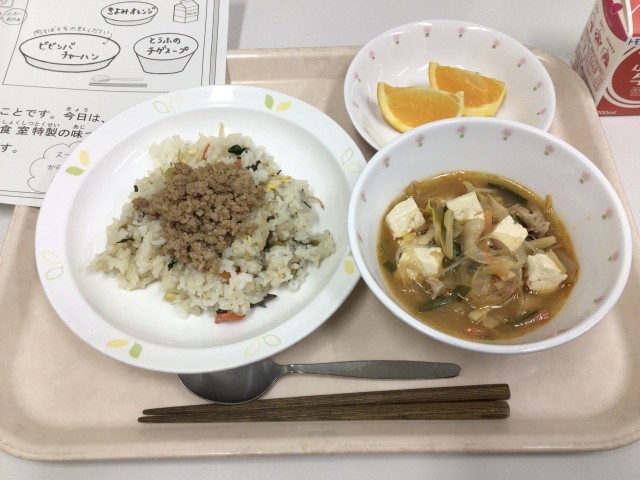 今日は、ビビンバチャーハン、豆腐のチゲスープ、清見オレンジ、牛乳です。