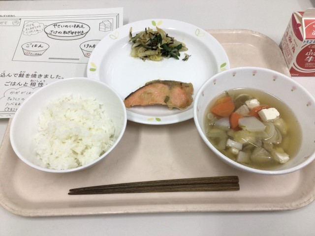 今日は、ごはん、鮭のねぎみそ焼き、野菜の磯あえ、けんちん汁、牛乳です。