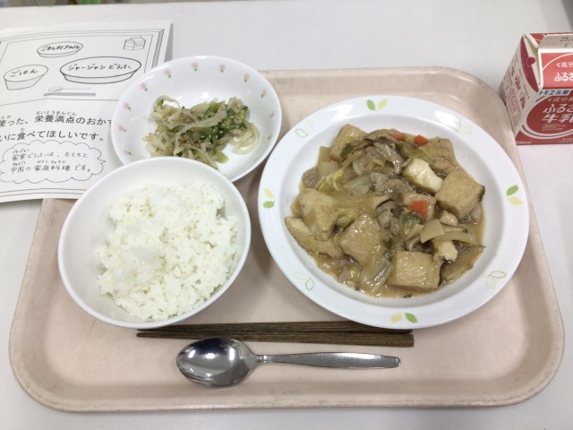 今日は、ごはん、家常豆腐、ごま塩ナムル、牛乳です。