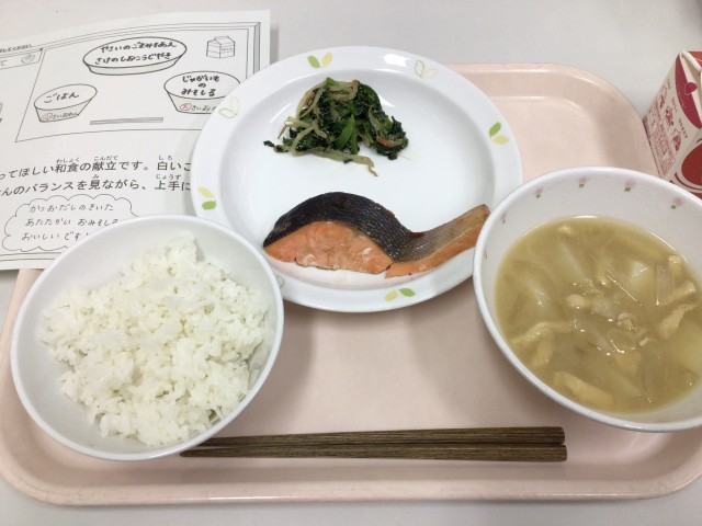今日は、ごはん、鮭の塩麹焼き、野菜のごまみそ和え、じゃがいものみそ汁、牛乳です。
