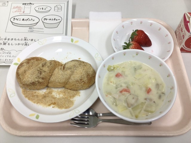 今日は、きなこ揚げパン、クリームシチュー、いちご、牛乳です。
