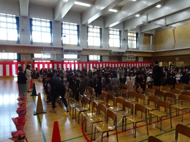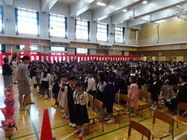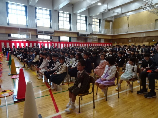 入学式がはじまりました。たくさんの友達、たくさんの大人の中でしたが、しっかりと椅子に座って2年生の歓迎の演技をみたり、校長の話を聞いたりできました。全部で172名の1年生、これからみんなで仲良く過ごしていきましょう。