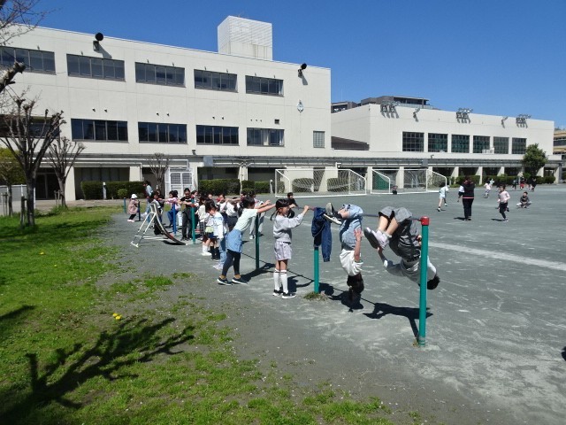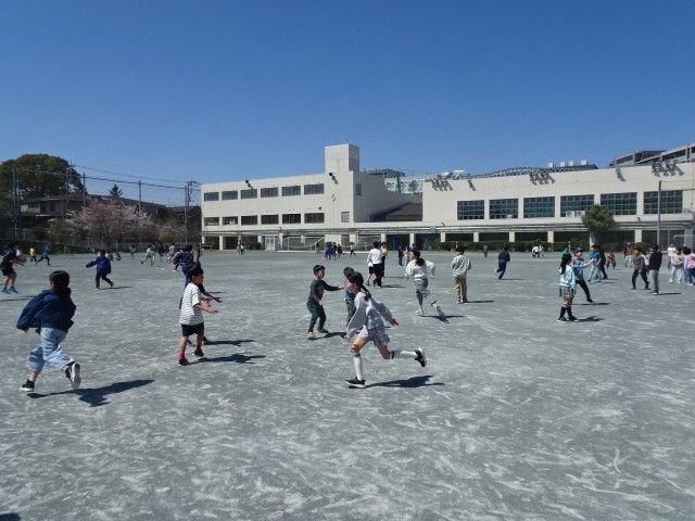 良い天気の中、広い校庭で子どもたちが遊んでいます。鬼ごっこをしたり、ボール遊びをしたり、遊具を使って遊んだり、みんな楽しそうです。今年もみんなで楽しく遊んで体をいっぱい動かしましょう。