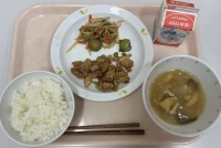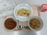 今日の給食は、五目うどん、野菜の浅漬け、キャロットケーキ、牛乳です。