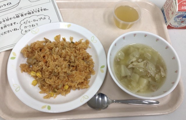今日の給食は、チキンライス、野菜とベーコンのスープ、りんごゼリー、牛乳です。