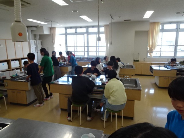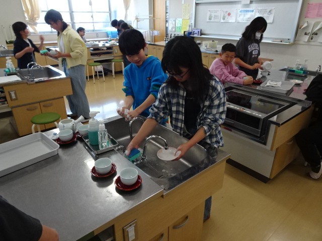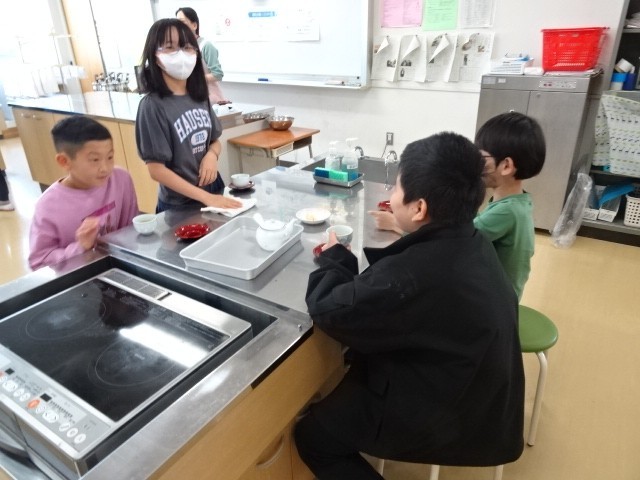 5年生になって家庭科の授業がはじまりました。今日は、1組がお茶を入れて飲む授業をしていました。みんな「美味しく」いただいていました。飲み終わった後の片付けも協力して行っていました。