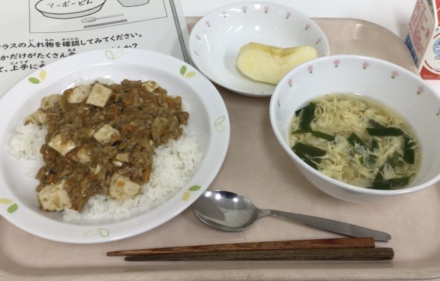 今日の給食は、麻婆丼、ニラ卵スープ、りんご、牛乳です。