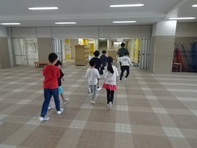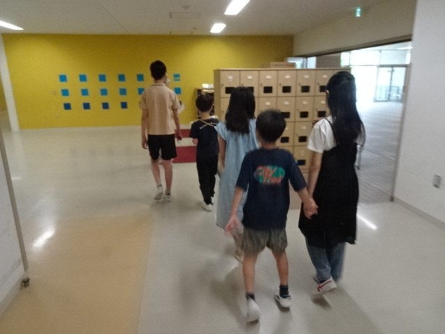 ひかり学級に入学した1年生を上級生が一緒に案内しています。いろいろな教室を案内しながらシールを貼っています。たくさんの部屋がありましたが、しっかりと案内していました。