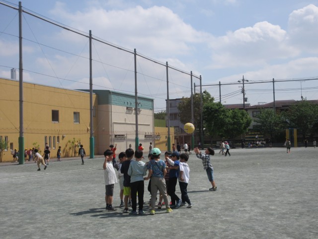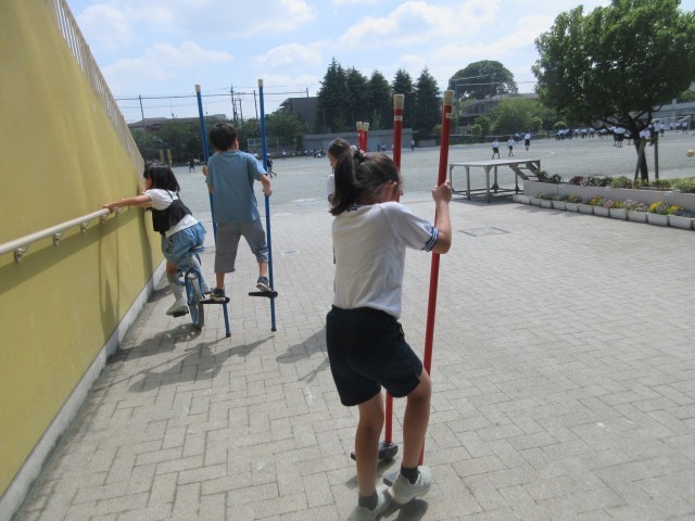 温かい日差しの中、子どもたちは元気に外遊びを楽しんでいます。友達と一緒にドッジボールで盛り上がっている姿もあれば、黙々と竹馬や一輪車に挑戦する姿もありました。みんな楽しそうです。そして、小学生が遊んでいる先には、中学生が遊んでいる姿が見えるのも芦花小学校ならではの光景です。
