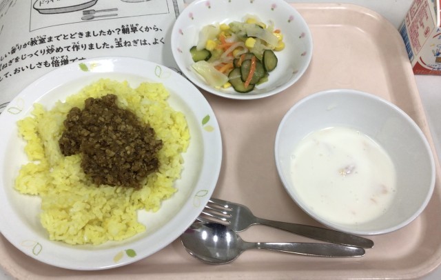 今日の給食は、ドライカレーライス、コーンサラダ、フルーツヨーグルト、牛乳です。