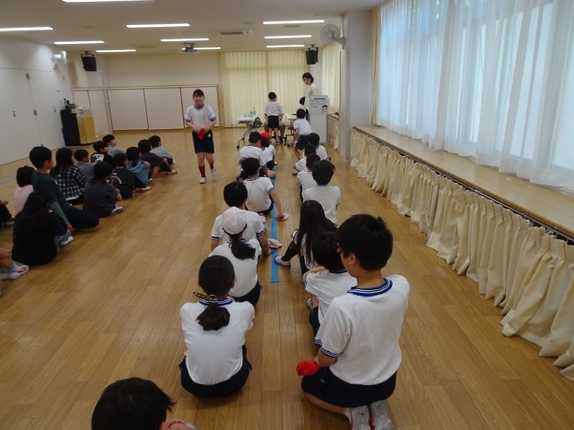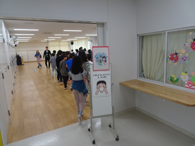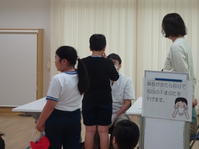 多目的室で4,5,6年生の眼科検診がありました。さすが上学年の子どもたち、静かに並んで指示を守って検診を受けています。