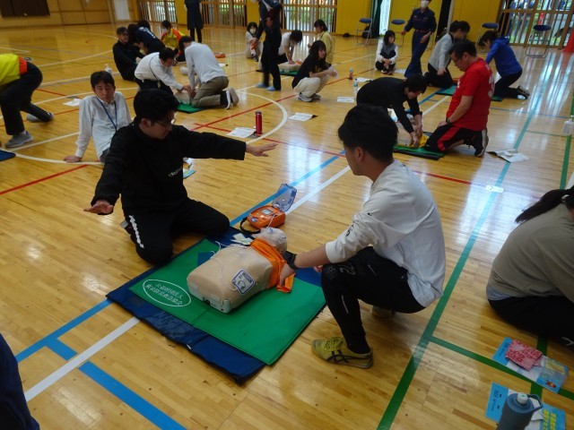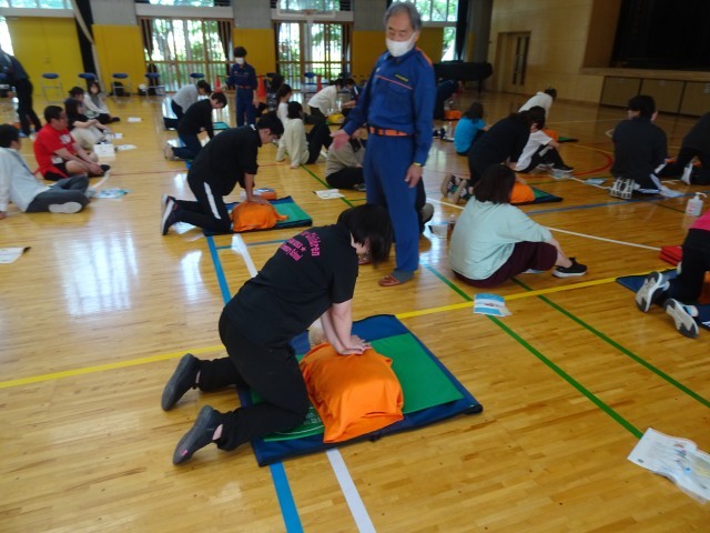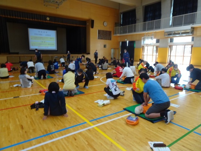 子どもたちが下校した後の体育館で先生方が「救急救命講習」を受講しました。水泳指導前に毎年、心肺蘇生やAEDの使い方など講習を受けています。子どもたちの命を守るための講習、講師の先生の話をしっかりと聞き、実際に心配蘇生の方法やAEDの使い方など体験しながら学びました。