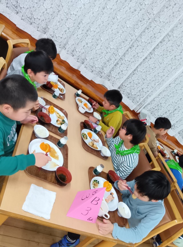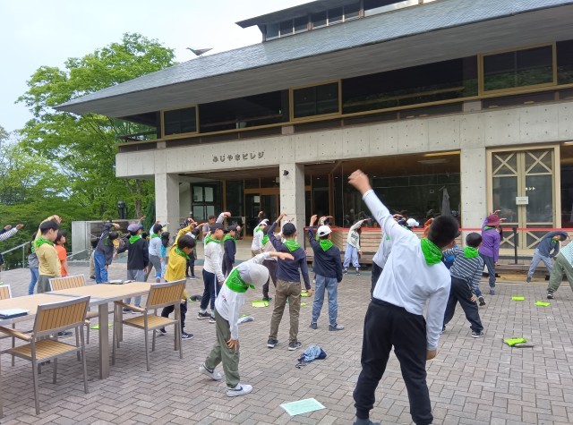 朝は6時に起床し身支度、布団をたたみ、朝の会です。清々しい空気の中、保健係さんの見本で体操をしました。食事係さんが朝食の準備を整えました。それぞれの仕事に責任をもって取り組んで生活しています。