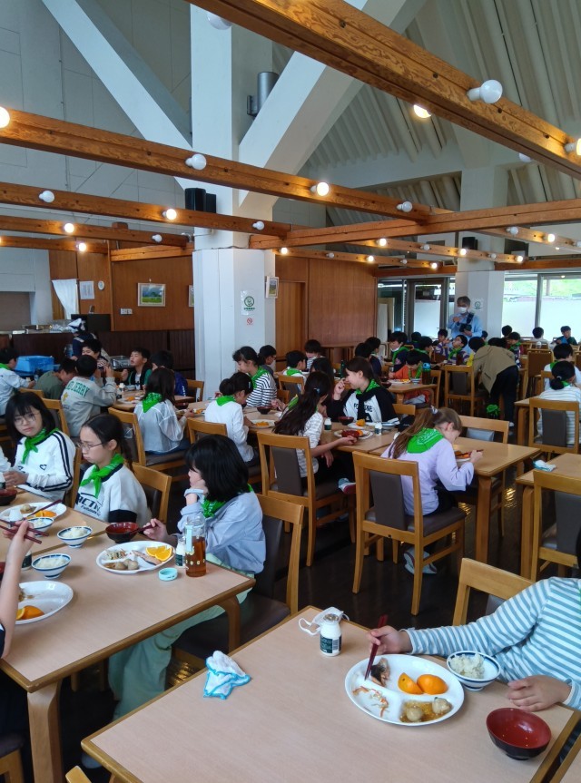 川場村の朝は涼しいです。広場に集まりラジオ体操をしました。音響機材のトラブルもありましたが、しっかり体を動かしました。食事係を中心に配膳を上手に行いました。これからハイキングの準備です。