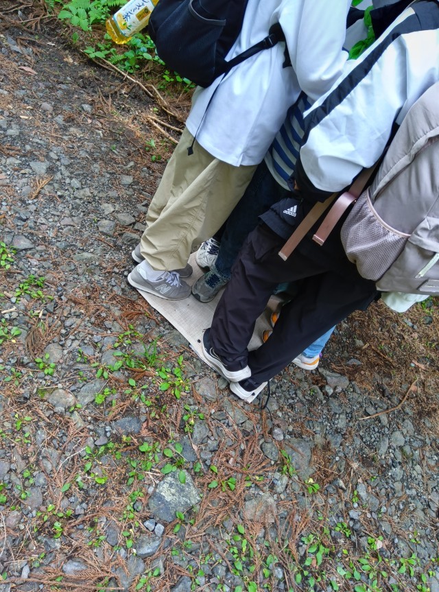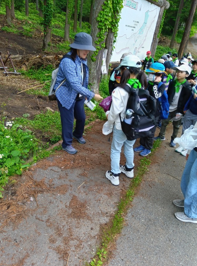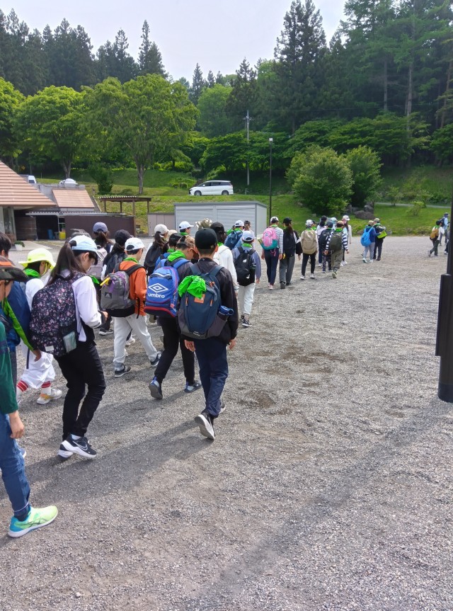 ヒロイド原のハイキングです。各ポイントで出される問題に協力して取り組みました。少し早めに宿舎に戻りマスつかみの準備の準備となりました。