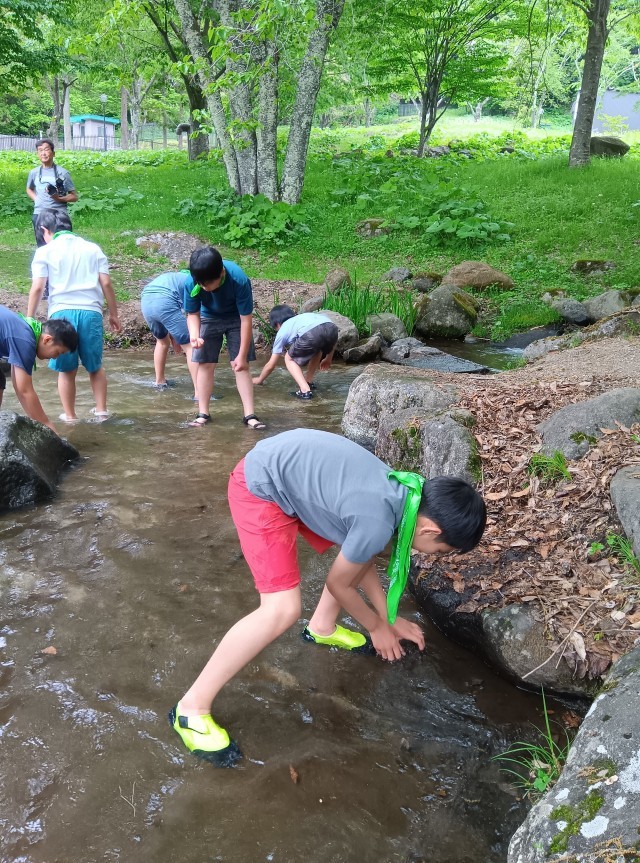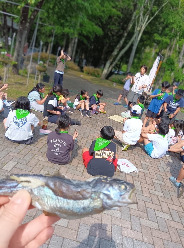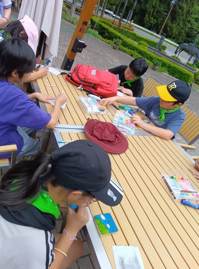 マスつかみを体験しました。冷たい清流に放たれたマスに挑みます。すばしこいマスの動きやつるつるした感触に驚きながらもしっかりとつかみ取りました!制作は、木材をヤスリでけずり思い出のコースターを作りました。