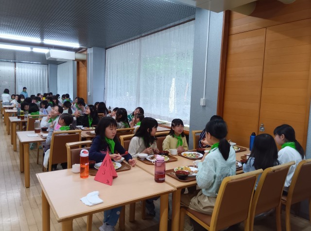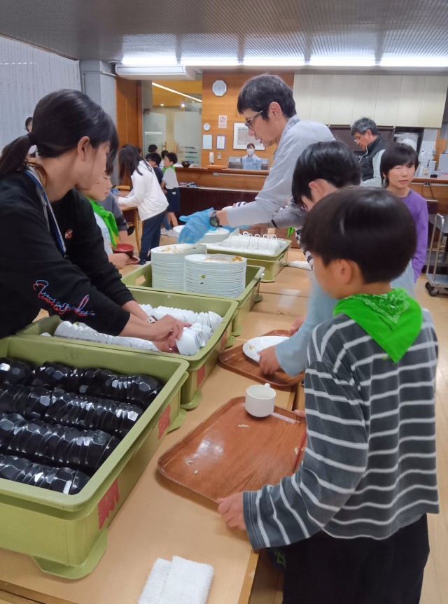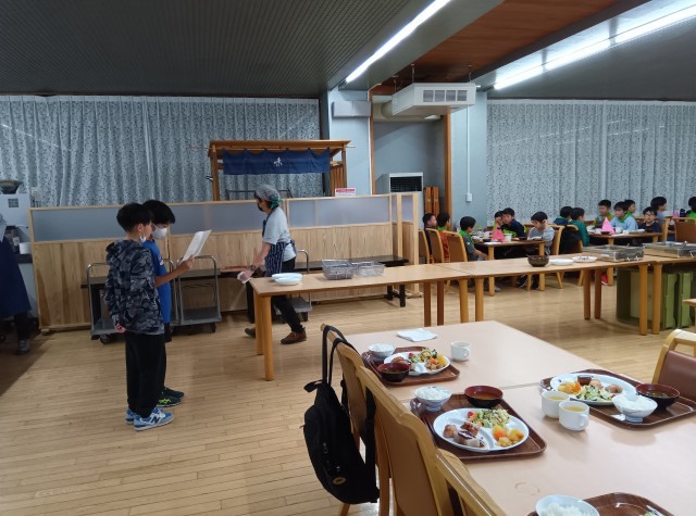 2日目夕食です。食事係の配膳やいただきますのあいさつ、片づけもスムーズになってきました。川場りんごジュースは絶品でした。