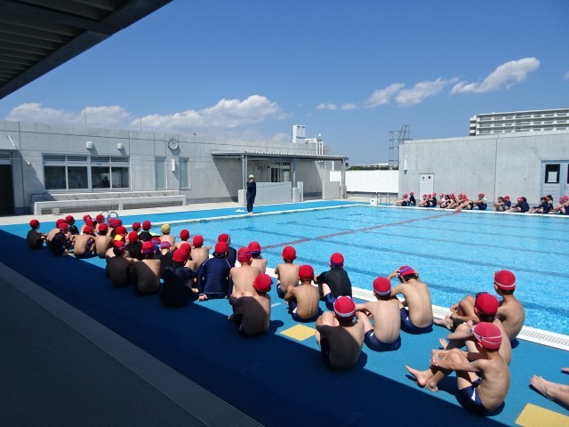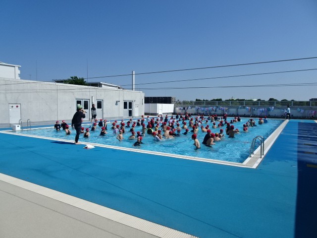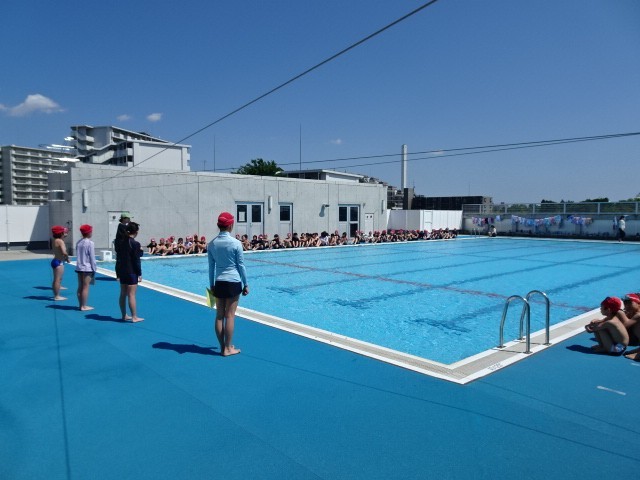 良い天気の中、4年生が今年、最初のプールの授業を行いました。プール開きでは代表の子が今年のめあてをしっかりと話していました。水泳のルールの確認や避難経路の確認をしたうえで、水に入りました。まだ、水は少し冷たいようでしたが久しぶりのプールの授業を楽しく、安全に行っていました。