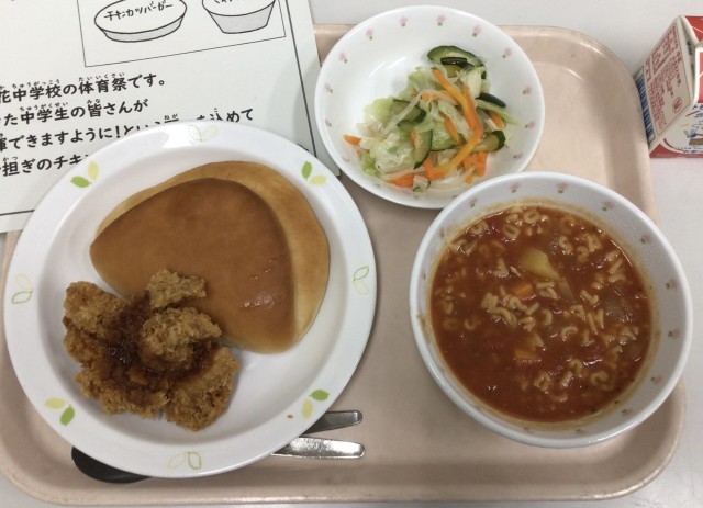 今日の給食は、チキンカツバーガー、ミネストローネ、フレンチサラダ、牛乳です。