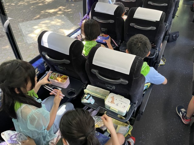 砧公園に到着。気温が高いのでバスの中でお弁当を食べています。美味しいお弁当、ありがとうございました。いただきます。
