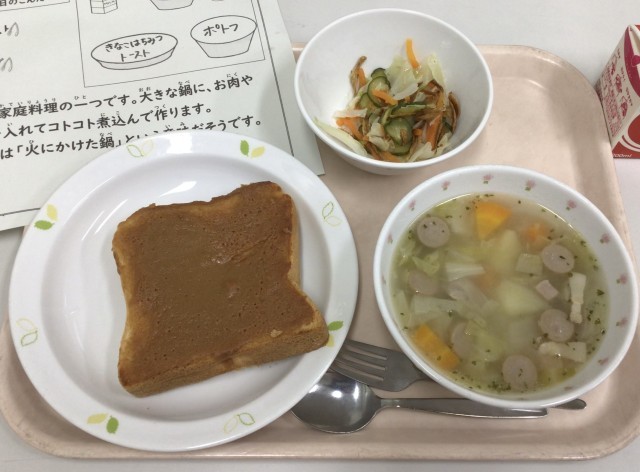 今日の給食は、きなこはちみつトースト、ごぼうチップスサラダ、ポトフ、牛乳です。