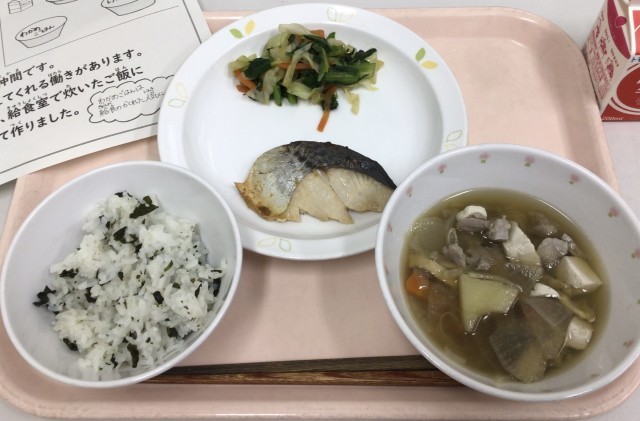 今日の給食は、わかめごはん、さわらの香味焼き、野菜のからしあえ、けんちん汁、牛乳です。