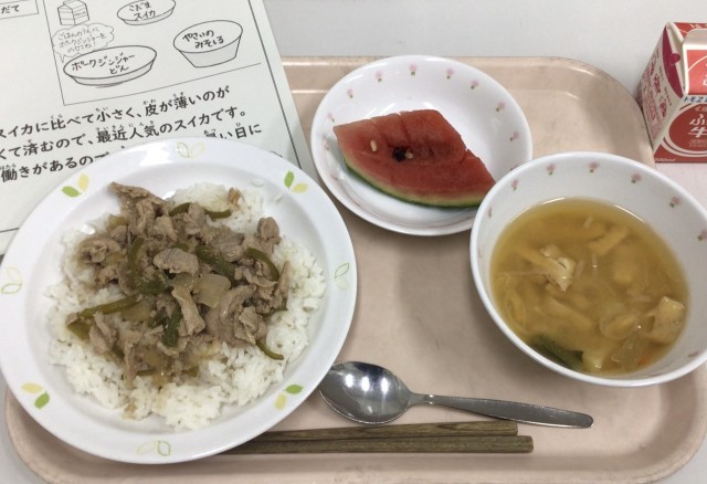 今日の給食は、ポークジンジャー丼、野菜のみそ汁、小玉スイカ、牛乳です。