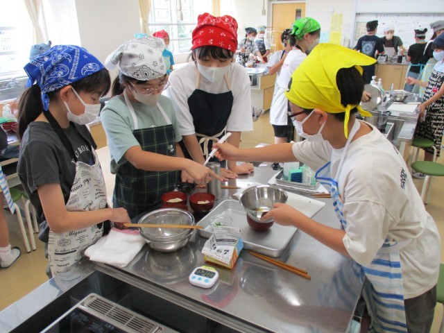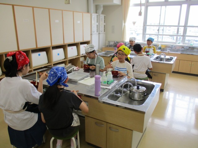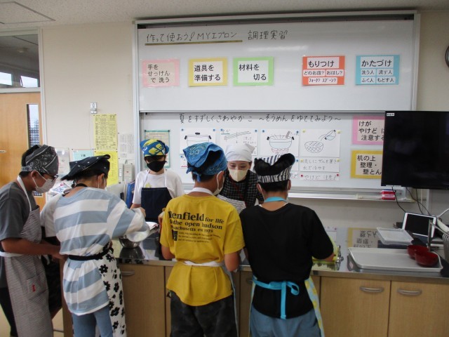 今週は、6年生の調理実習が行われます。家庭科の授業で作った自分だけのエプロンを付けて、そうめんをゆでる実習です。夏にぴったりのそうめんが美味しくゆであがりました。