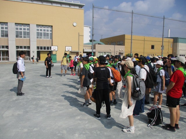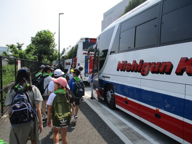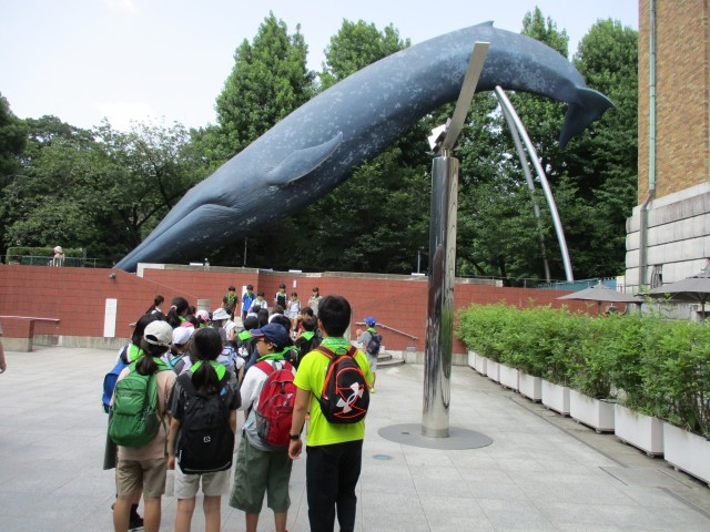 科博のシンボルのシロナガスクジラをバックに行動班ごとに写真を撮って見学は終了。バスで学校に戻りました。道もすいていたので時間通りに当直しました。暑い中での見学になりましたが、芦花小学校の6年生らしい態度で見学をすることができました。今日はゆっくり休んで、明日からのまとめもしっかりとしましょう。