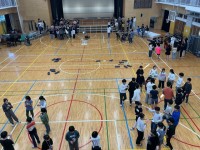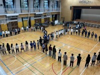 リハに向けて声出し。心と体を温めて、いざ体育館へ。