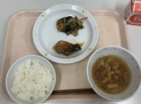 今日の給食は、ごはん、大豆とじゃこの甘辛揚げ、肉じゃが、根菜のみそ汁、牛乳です。
