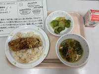 今日の給食は、ツナピラフ、豆腐ナゲット、にんにく玉子スープ、牛乳です。