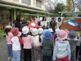 八幡山保育園に到着し、園庭で園児を前に段ボールバンガローを紹介しているところで...