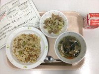 今日の給食は、おまめチャーハン、スタミナサラダ、小松菜ともやしのスープ、牛乳です...