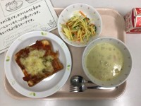 今日の給食は、チキンとトマトのスパゲッティー、枝豆とコーンのソテー、みかんヨーグ...