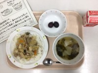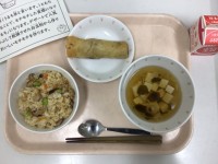 今日の給食は、中華おこわ、春巻、豆腐とわかめのスープ、牛乳です。