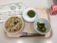 今日の給食は、かき玉うどん、きゅうりのピリカラ、抹茶ケーキ、牛乳です。