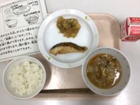 今日の給食は、ごはん、魚の西京焼き、じゃがいもの煮付け、きゃべつのみそ汁、牛乳で...