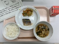 今日の給食は、ごはん、鯖のみそ煮、野菜のおひたし、沢煮椀、牛乳です。