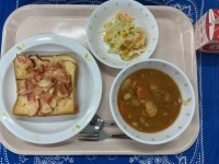 えびクリームライス海藻サラダくだもの(りんご)牛乳配膳している1年生から、「どう...